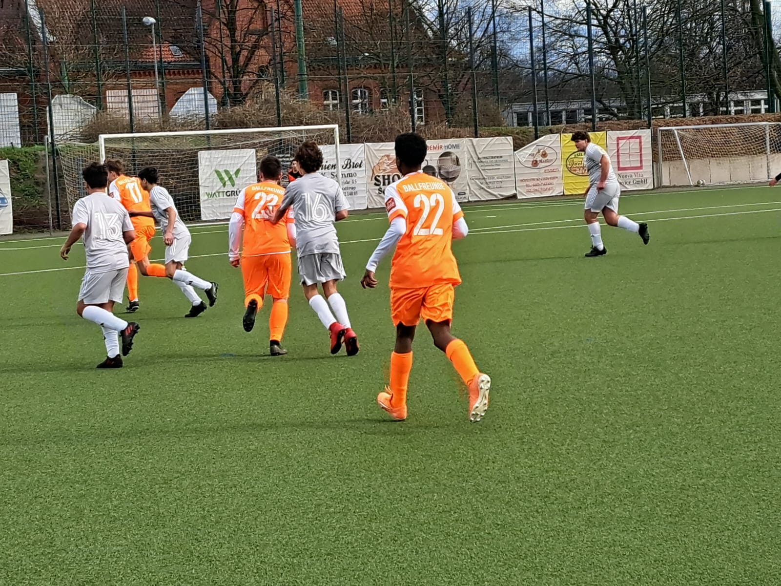 Einige Minuten später hatten dann die Ballfreunde Ihre 100% Chance. Capitano Kunze hatte bei einem Einwurf die geniale Idee, einfach mal die ganze Abwehr zu überschmeißen und damit Abwehrchef Finn Haupt den Weg zum Gehäuse des Gastgebers zu ebnen. Finn packte seine Gelegenheit beim Schopfe und startete durch, nahm den Ball an und nagelte die Pille an den Querbalken des Gastgebers.